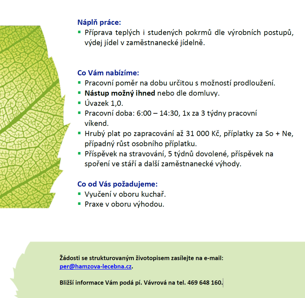 Žádosti se strukturovaným životopisem zasílejte na e-mail: per@hamzova-lecebna.cz.