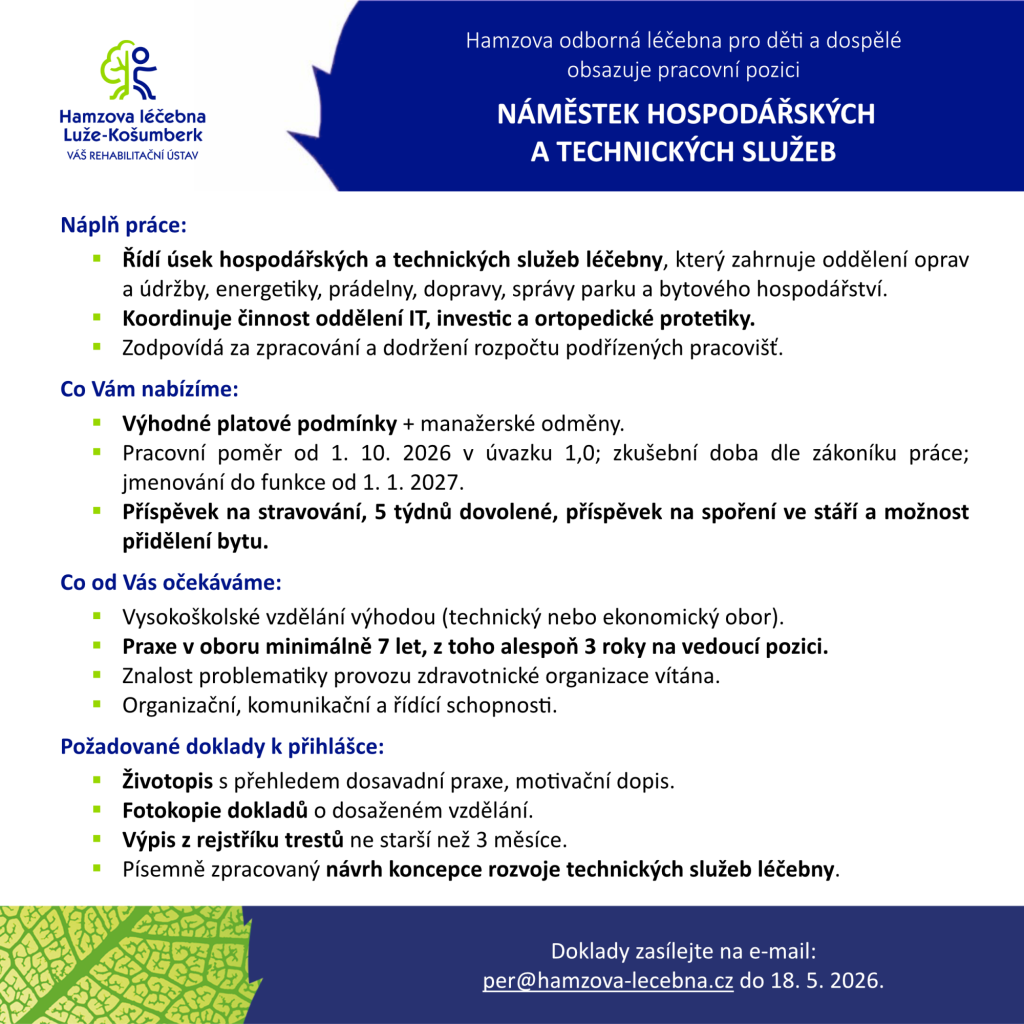 Doklady zasílejte na e-mail per@hamzova-lecebna.cz do 18. 5. 2026.