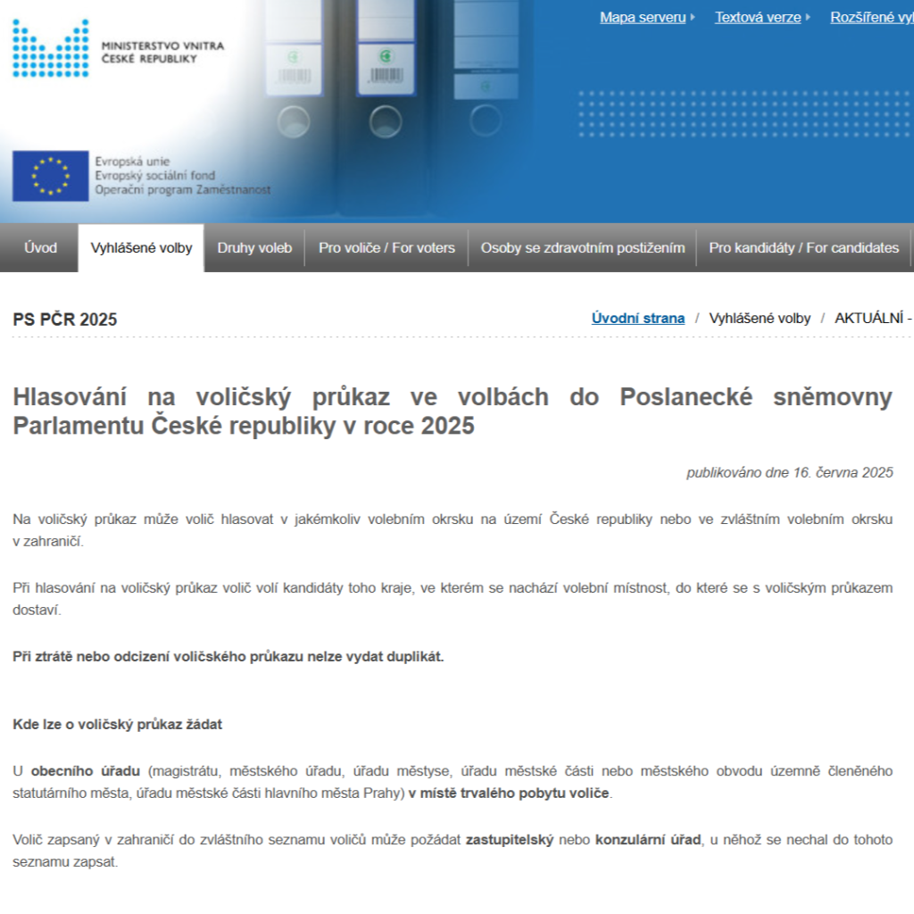 Více informací: Hlasování na voličský průkaz ve volbách do Poslanecké sněmovny Parlamentu České republiky v roce 2025 - Volby